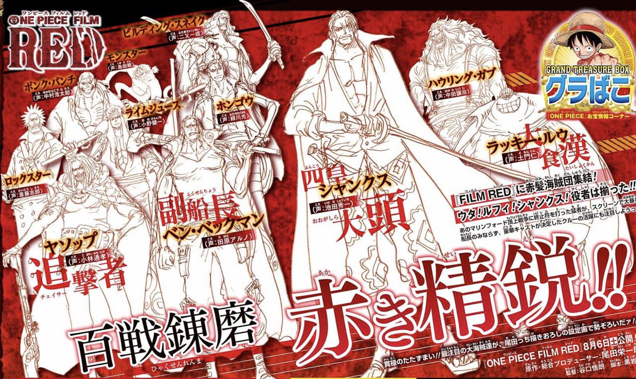 麦わらの一味操舵手。異名は「海侠のジンベエ」。本作が劇場版初登場。 シャンクス 声 - 池田秀一 赤髪海賊団船長。四皇の一人。異名は「赤髪のシャンクス」。 ベン・ベックマン 声 - 田原アルノ 赤髪海賊団副船長。 ラッキー・ルウ 声 - 土門仁 赤髪海賊団戦闘員。 ヤソップ 声 - 小林通孝 赤髪海賊団狙撃手。ウソップの父。 ライムジュース